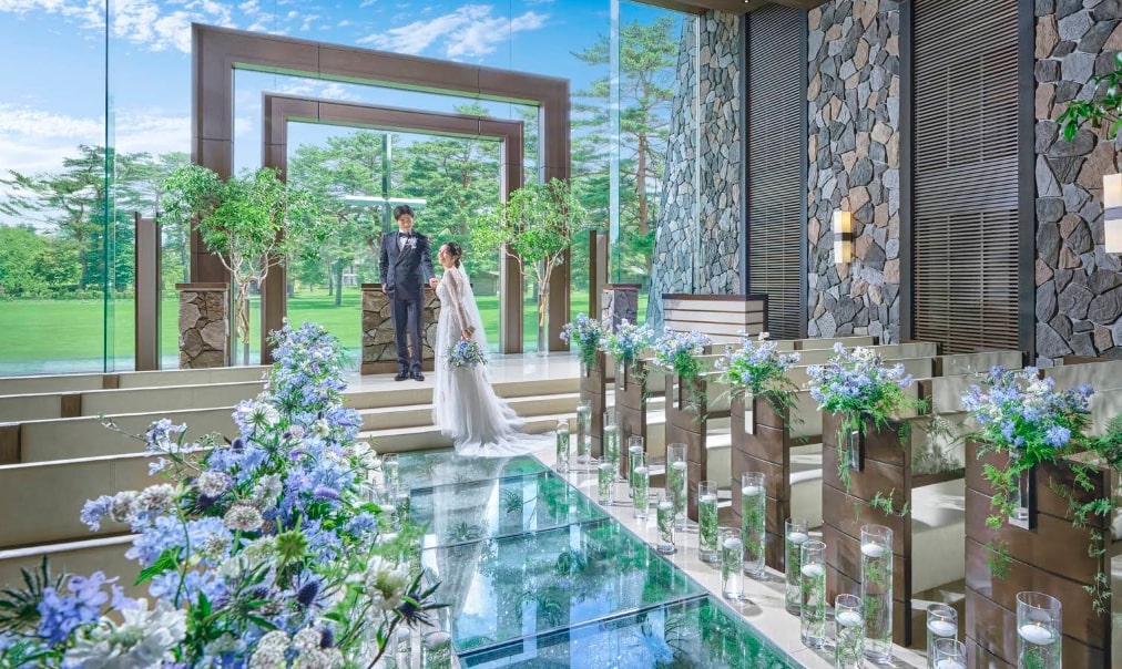 チャペルでの挙式シーンは、フォレスターナ軽井沢内にある全面ガラス張りのチャペルで撮影されました。