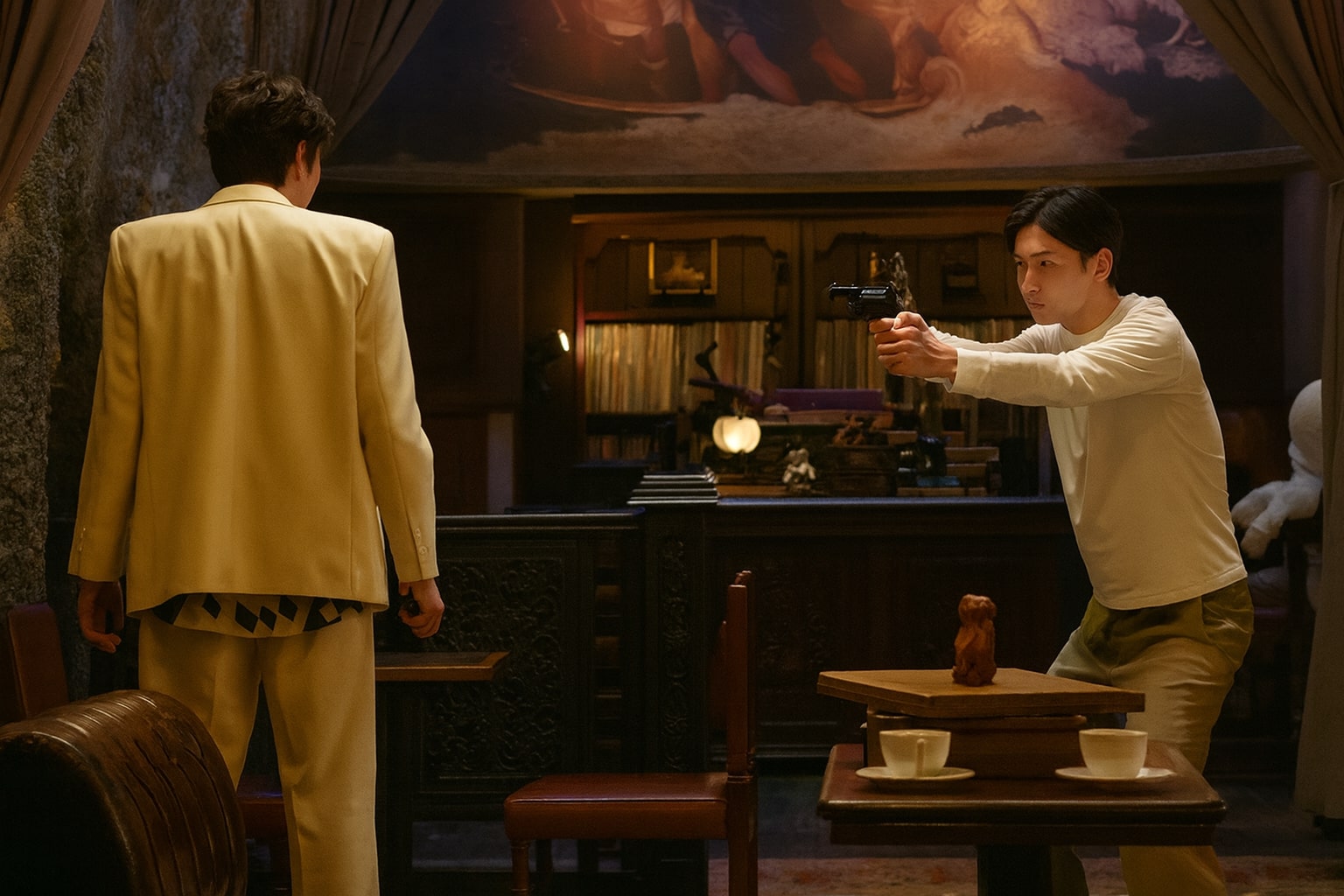 テンペストでの対峙シーンでは、久部(菅田将暉)が劇団員から持ち出したおもちゃの拳銃を手にトロへ向けました。