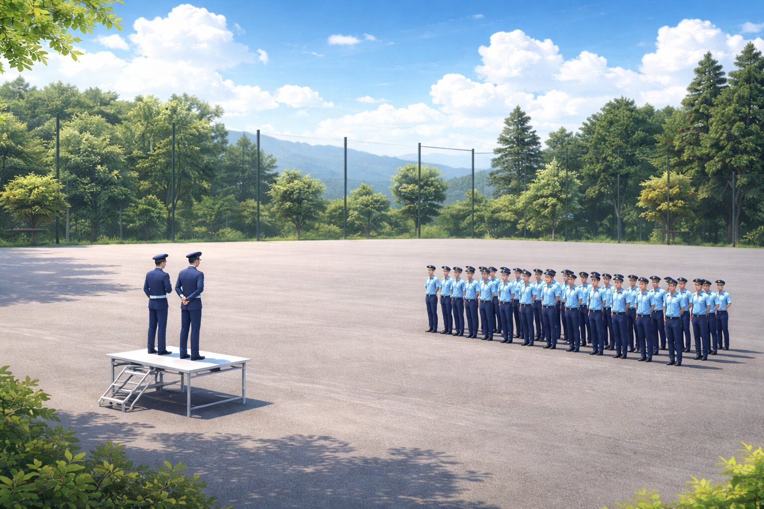 集団走・隊列訓練・号令に合わせた動きなど、警察学校らしい屋外訓練が映るのがグラウンドです。